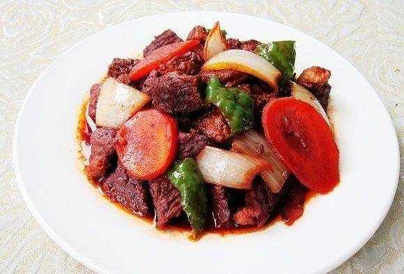 牛肉500克,洋蔥30克,胡蘿卜20克,青椒1個,植物油適量,精鹽適量,豆瓣醬適量,番茄醬適量,香草1株,八角1顆、銀杏1棵(幹)