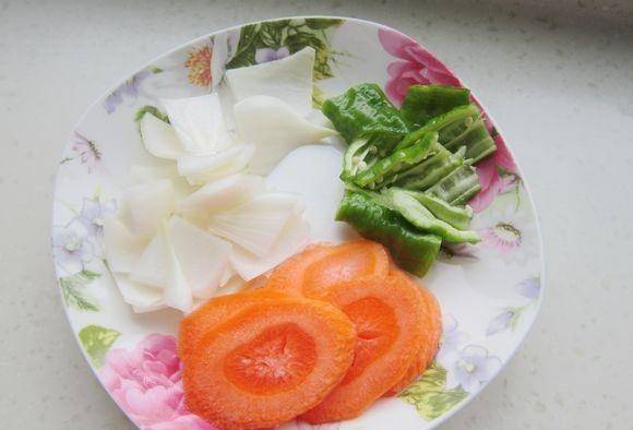 3.洋蔥切塊,青椒切塊,胡蘿卜洗凈切片
