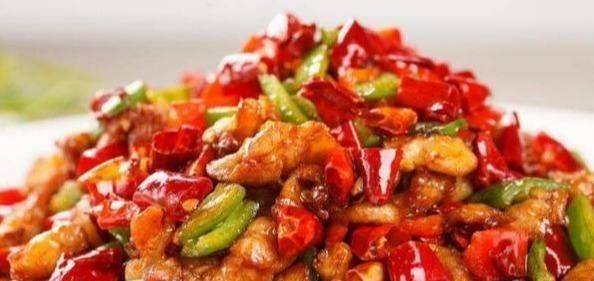 6.放約。50克油用中火加熱至50%,加入蔥、薑、蒜、幹辣椒、花椒爆香。倒入炸好的雞塊,炒至雞塊均勻分佈在辣椒中。加入雞粉3克、鹽1克、白糖10克、芝麻20克,撒上少許蔥末,均勻烘烤即可食用。