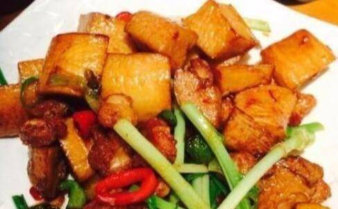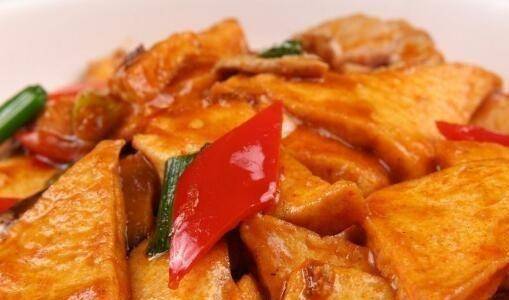 4、鍋燒熱放油,放入肉片翻炒變色,放入炸好的豆腐塊、香菇,加一勺醬油、料酒、郫縣豆泥、白糖,或加入鹽,用大火煮沸調味,慢慢搖動鍋以混合。不粘鍋,待湯汁減半後,加入青椒,淋上濕芡粉勾芡即可上桌
