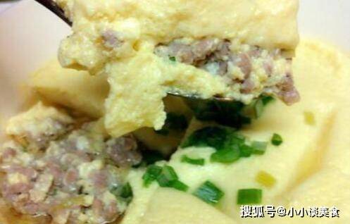 3、肉末加入糖、醬油、鹽和蔥花、薑末拌勻。將油放入鍋中。油熱後倒入肉末;炒熟;取出蒸蛋取出蓋子,表面平整如鏡,將肉末倒入蒸蛋中即可。