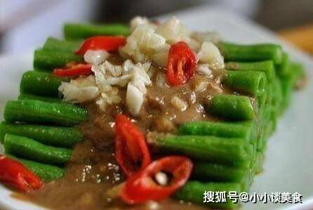 將豆角抽好,切塊,洗凈,浸入開水鍋中,再浸入冷水中,撈出切碎,放入攪拌碗中。然後用冷開水將芝麻豆豉調成糊狀,燒熱花椒油,加入細鹽、味精、薑末澆在豆角上,拌勻裝盤。
