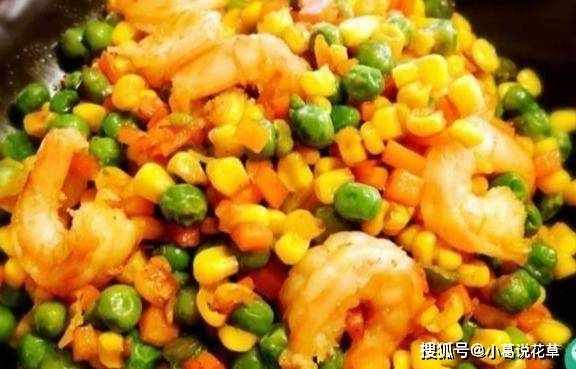 4.另起一熱油鍋,倒入蒜末、黃瓜丁、胡蘿卜丁和玉米粒,加少許鹽炒至半熟