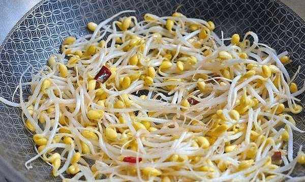 3、起鍋後,先將食用油、大蒜、幹辣椒倒入鍋中,然後放入黃豆芽翻炒片刻。