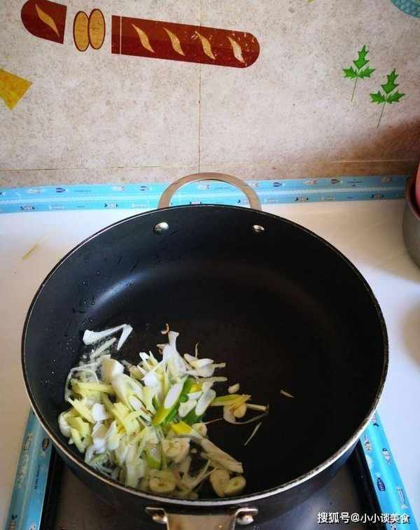 4.熱鍋下冷油,加入蔥、薑、蒜爆香