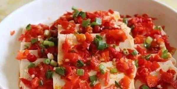 做法:1、內酯豆腐切成大片,放在盤子裡,在豆腐片上鋪一層剁椒,放入蒸鍋中火蒸5分鐘,取出倒在盤子裡多餘的水.