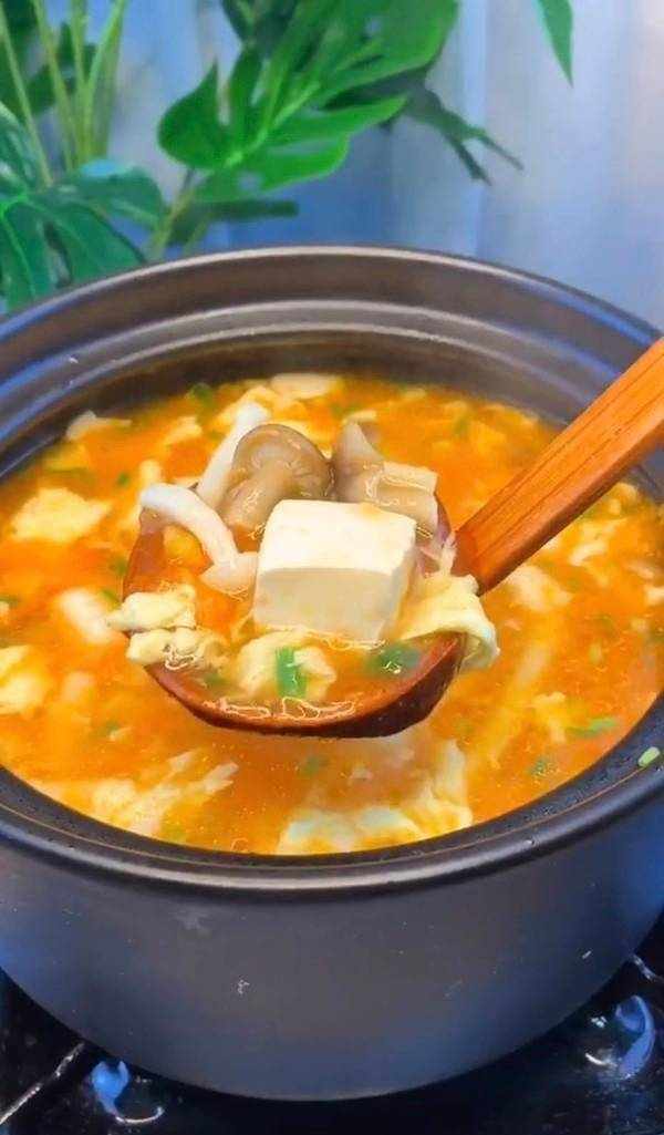 番茄400克,海鮮菇100克,豆腐適量,雞蛋50克,輔料鹽適量,雞精適量,生抽適量,水淀粉適量