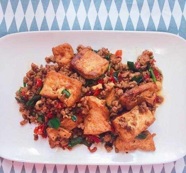 材料:豆腐250克,肉末150克,花椒2勺,蒜2瓣,韭菜少許,生抽3勺,蠔油1勺,高湯1碗沒有);