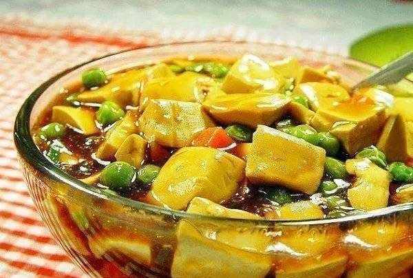 材料:豆腐半塊、豌豆、胡蘿卜丁少許。薑絲、香菇粉、花椒水、醬油、糖。