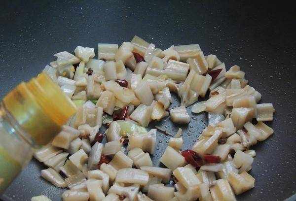 6、將切好的蓮藕瀝幹水分,放入鍋中,翻炒一分鐘左右。