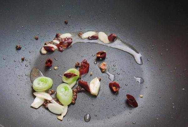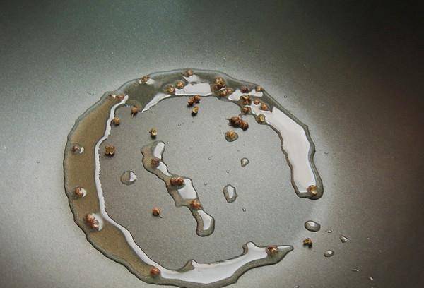 4.加熱煎鍋。鍋熱後,加入1湯匙食用油,再加入花椒10多粒,小火炒出香味。將辣椒放入冷油熱鍋中,不要炒。吃的時候為瞭避免吃到花椒,可以把花椒去掉,隻留油。