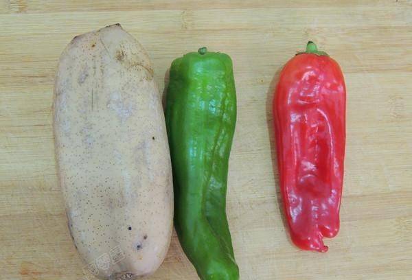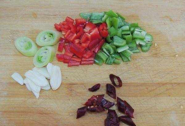 3、青紅椒去掉辣椒和辣椒籽,然後換刀切成小片。剝去大蒜的外皮,切成薄片。將蔥切成薄片。將幹紅辣椒洗凈,取辣椒籽斜切成小圓圈。