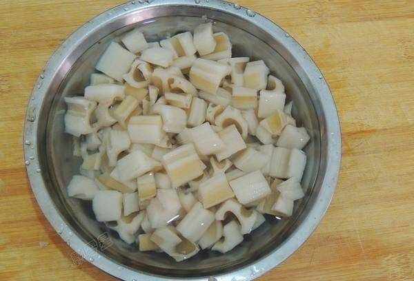 2、蓮藕洗凈後,剝去外皮,然後用刀切成小塊。將切好的蓮藕用淡鹽水浸泡,以防氧化變黑。