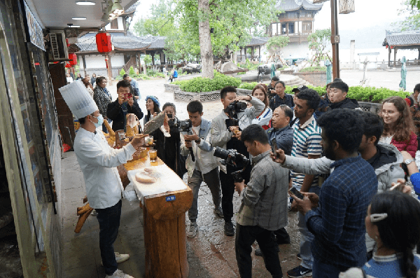 “老板,來份李莊白肉!”幾乎每個落腳李莊的人都必點一份白肉,這是來李莊吃飯的“規矩”。巴掌大的白肉,肥瘦相間,壓實放在辣椒蘸水裡,塞入口中,絕!刀工精湛的何師傅切白肉如表演般行雲流水,單手拿起寬大菜刀,白肉被切到厚度不超過2毫米,對著光可透出人影。“這得多薄啊!”來自斯裡蘭卡的幸運拿起手機不斷拍照。白肉與白糕、白酒並稱為“李莊三白”,這一趟,讓各國友人們實實在在被李莊古鎮圈粉。
