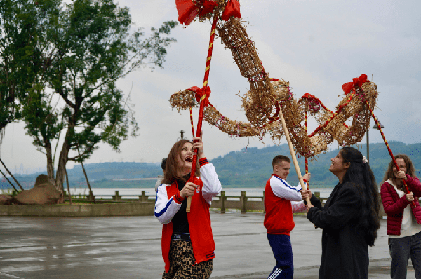 作為省級非遺項目,李莊草龍龍骨取自竹,龍身以金黃的稻草紮制而成。草龍舞配以鑼、鼓等進行表演,十分熱鬧。在藝人的翻舞騰挪下,一時間真的如一條巨龍飛舞,威猛靈動、栩栩如生,令人挪不開眼。“我來試一下打節奏!”來自烏克蘭的柴可夫斯基拿起鼓錘加入瞭草龍舞的表演隊伍。友人們踩著鼓點,拿起竹竿,跟著老師們舞起瞭草龍。除瞭舞草龍,友人們還親手體驗瞭李莊草龍制作,瞭解瞭當地悠久的草龍文化。