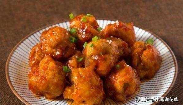 6.用中火收集醬汁。醬汁煮熟後,倒入炸好的肉塊翻炒,使每一塊都均勻地沾上醬汁。關火上菜。在上面撒上一些蔥花,櫻桃肉就做好瞭!