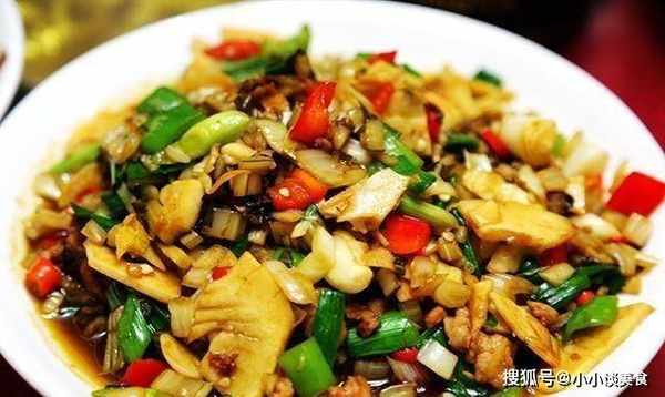 3.將油倒入煎鍋中。油熱後,先把撕破的筍片倒入油中炸一下,再加入撕破的香菇一起翻炒。燒少許料酒炒一會即可上桌
