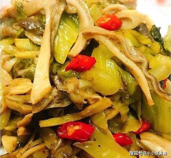 3、加入酸菜翻炒至幹,然後加入糖,讓酸菜充分吸收糖味,不會太酸;