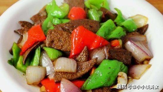 3、熱鍋冷油,放入薑片、芝麻椒、豬肝快速炒勻,加入適量老抽上色,炒勻後加入蒜苔、芝麻椒翻炒;