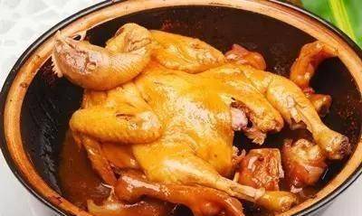 5.打開鍋蓋,掀起竹席,取出豬蹄和三黃雞,原汁入鍋,豬蹄放回鍋內,三黃雞入鍋,大火收汁,倒入平底鍋,蓋上鍋蓋,放在粘土上加熱3-5分鐘後,就可以去菜瞭。