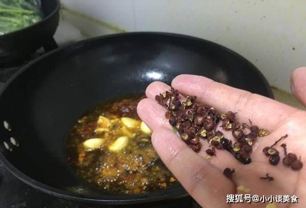 7、做鍋底:熱鍋燒熱油,轉小火,油溫後,依次加入豆瓣醬、辣椒面、薑、蒜、胡椒粉。開中火煮兩分鐘