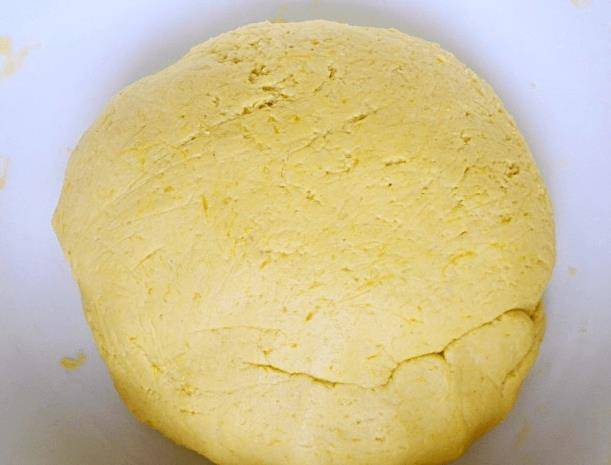 3、在南瓜泥中加入適量的糯米粉,邊加邊攪拌,直到南瓜泥變成面粉狀,然後揉成光滑的面團。如果揉好後面團還很粘,可以再加點糯米粉。