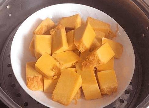 1.南瓜去皮洗凈切片,不要太厚。然後放入蒸鍋中隔水蒸10分鐘左右,至完全蒸熟。