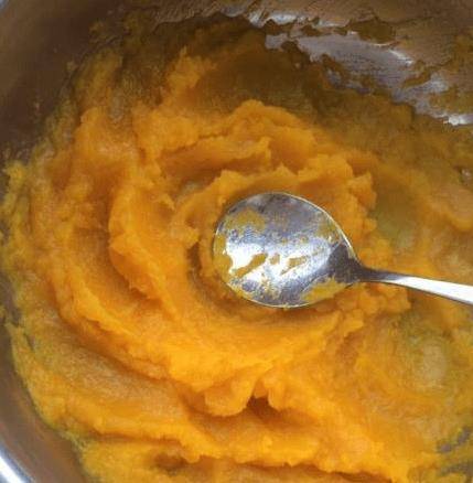2、南瓜蒸熟後,將水倒入碗中,用勺子將南瓜搗成泥。