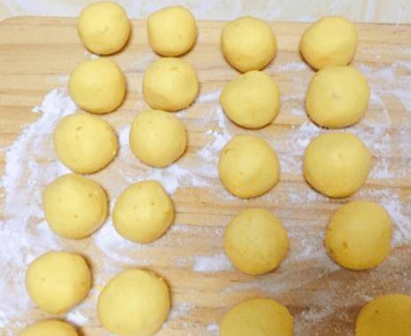 4.將面團揉成長條,然後用手將面團揉成大小均勻的小塊,揉成粘團。不要太大,否則不容易煮熟。