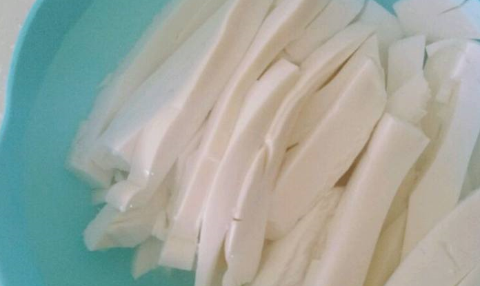 3.豆腐切條,浸泡在淡鹽水裡