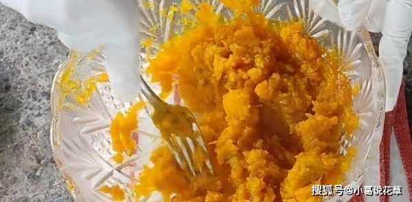 南瓜洗凈,去籽去皮,切去1/4備用。去皮後,將南瓜切成小塊,放入蒸鍋蒸15分鐘。南瓜取出後,倒掉水放入碗中,根據個人口味加入適量的糖與南瓜一起攪拌成糊狀。