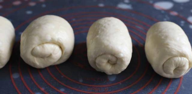 在砧板上塗上少許奶油,將發酵好的大面團倒在上面並按摩面團以幫助排氣。然後把大面團平均分成四份。切好後,將小面團整理成圓形,蓋上濕佈靜置15分鐘。