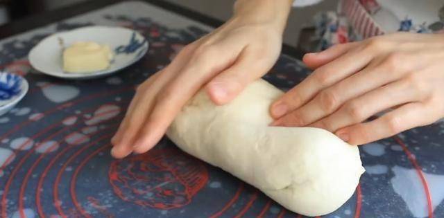 案板上抹少許黃油,將小面團搟平,用搟面杖朝四個方向拉伸。稍微搟成正方形,從兩邊向中間對折壓緊,把尾巴拉過來壓在砧板上,從一端卷到另一端。繞完後,順著末端方向的一邊會有一個螺旋。