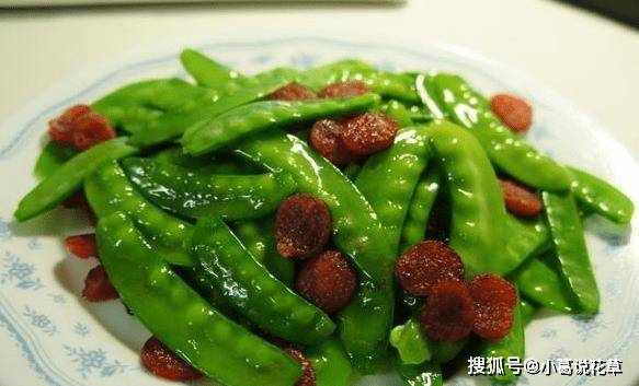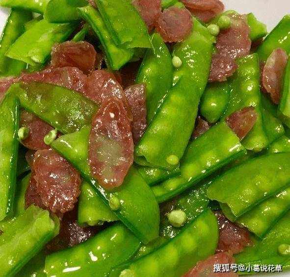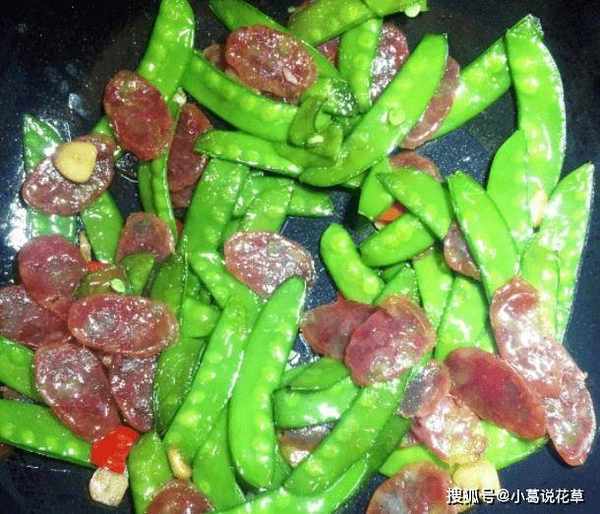 荷蘭豆炒腸,爽口,意味十足,香氣四溢,特別好吃。從營養學上來說,荷蘭豆中含有豐富的氨基酸,是人體重要的營養素,而荷蘭豆中的蛋白質可以被快速利用,有效地給身體帶來滋養,使身體健康。