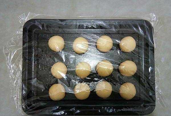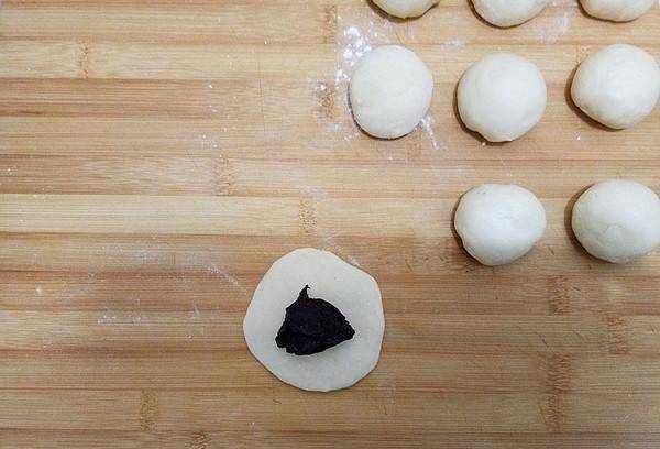 9.放上豆沙餡後收緊嘴巴,把所有餡料包好,蓋上保鮮膜再醒20分鐘。