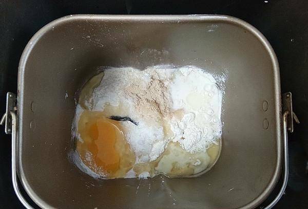 2.將除紅豆沙和椰絲外的所有材料放入面包機,啟動和面程序
