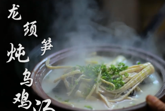 這一道是龍須筍燉烏雞湯,李子柒將竹筍切成一條條的形狀,和烏雞一起燉瞭一鍋滋補的湯。