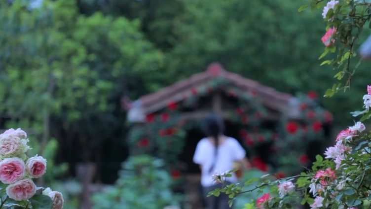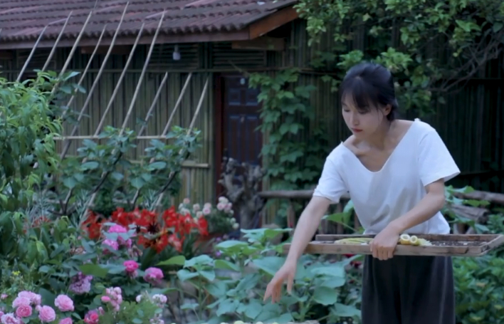 她在剝竹筍的時候,不論是近鏡頭還是背後的遠鏡頭,都有各自各樣的花爭奇鬥艷,看起來嬌艷欲滴。