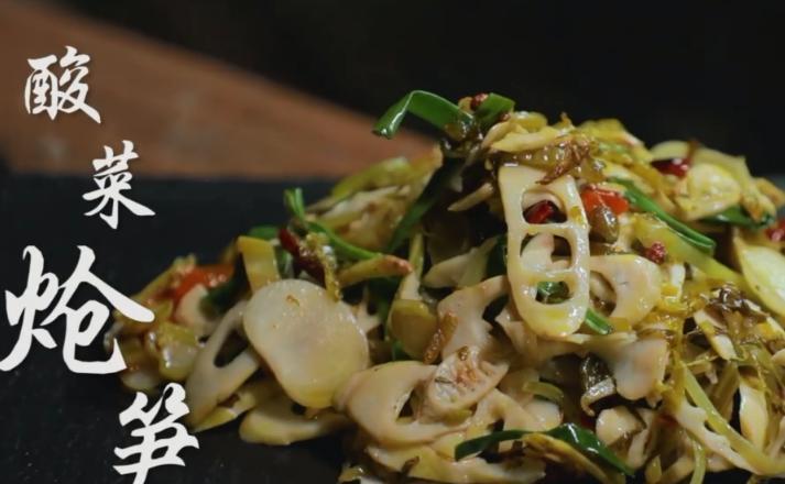 又將這些新鮮的竹筍切成片,拿出之前醃好的酸菜配在一起爆炒一下,做成一道酸菜熗筍。
