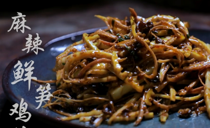 回傢之後,這個心靈手巧的姑娘用采到的竹筍做瞭許多美食,首先她用這些新鮮的竹筍和雞絲做瞭一道麻辣鮮筍雞絲,看起來十分誘人。