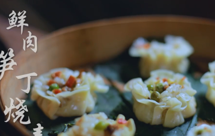 之後她又將這些新鮮的竹筍切成丁,和肉餡,青豆之類的配菜一起炒成菜,一部分用來拌米飯,一部分拿來蒸燒麥,她搟燒麥皮也十分熟練,最後包成一朵朵像小花一樣的燒麥,看起來很精致。
