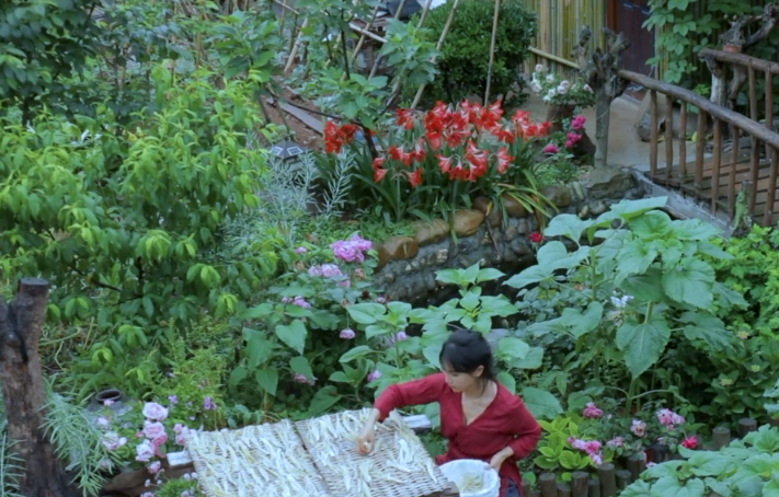 整個視頻中除瞭用竹筍做出來的各種大餐之外,每個鏡頭都被各種花花草草所填滿,而這些鏡頭也羨煞瞭萬千網友,不得不說這真的就像一個夢中的花園一樣!