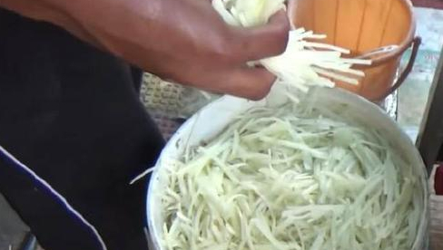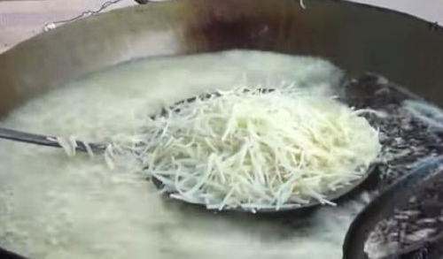 大叔的小攤上有一個大大的油鍋,大叔把土豆洗幹凈後,削皮,用工具刮成土豆絲,然後用水清洗一下,這樣做出來的土豆絲才脆口。