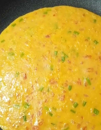 3、平底鍋刷油,倒入面糊,烙成餅,當下面凝固,輕微搖動鍋時餅開始滑動就可以翻面,再煎兩分鐘即可煎熟
