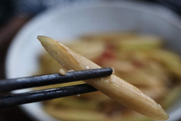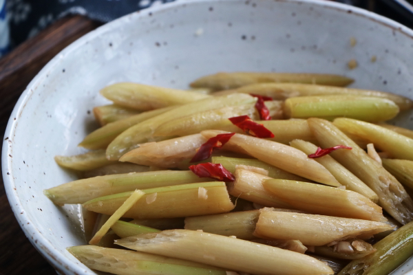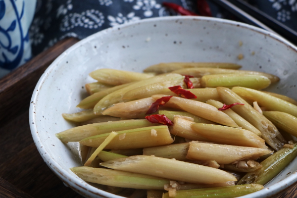 藕桿不需要翻炒太長時間,放入調料翻炒出汁就可以,大火把湯汁收收基本就可以;這樣炒出的藕桿脆爽多汁,而且越嚼越香;