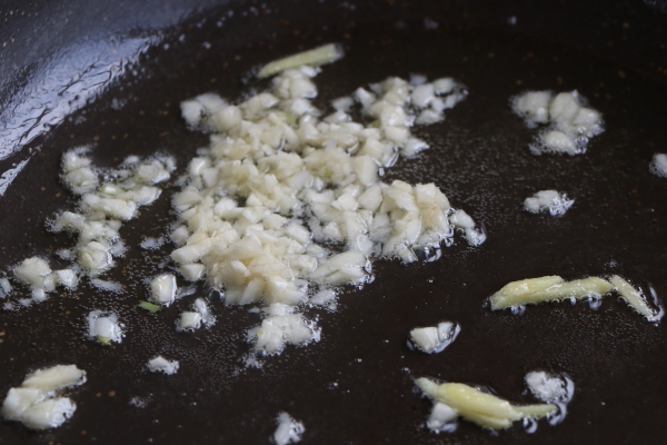2、準備2個大蒜切成末,生薑一片切成絲;鍋內放入少許植物油,放入大蒜、生薑絲炒香;