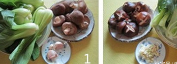 2.把香菇洗凈去除菌根,打上花刀。油菜去掉老葉,對半切開洗凈控水。大蒜切粒。