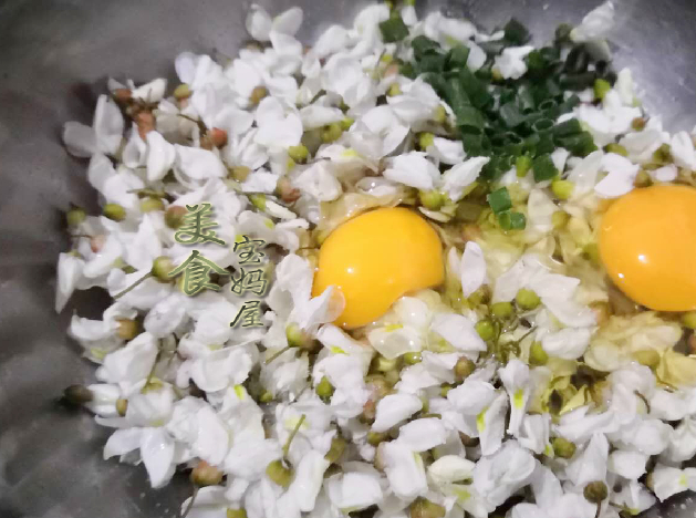 2、準備一個大點的盆,把沖洗幹凈控幹水分的槐花倒入盆中,打入2個雞蛋,加入切好的蔥花,少許食鹽和十三香,用筷子充分攪拌,混合均勻。