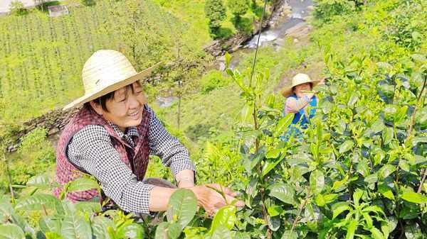 從河谷到山腰,一壟壟茶園“掛”在山坡,綠意盎然,生機勃勃。茶園中,伴著春茶的陣陣清香,茶農和遊客穿梭在茶壟間。