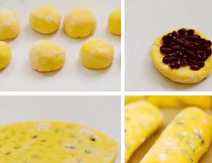 做法:面粉300g,南瓜200g,酵母3g,煮熟紅豆適量,細砂糖適量